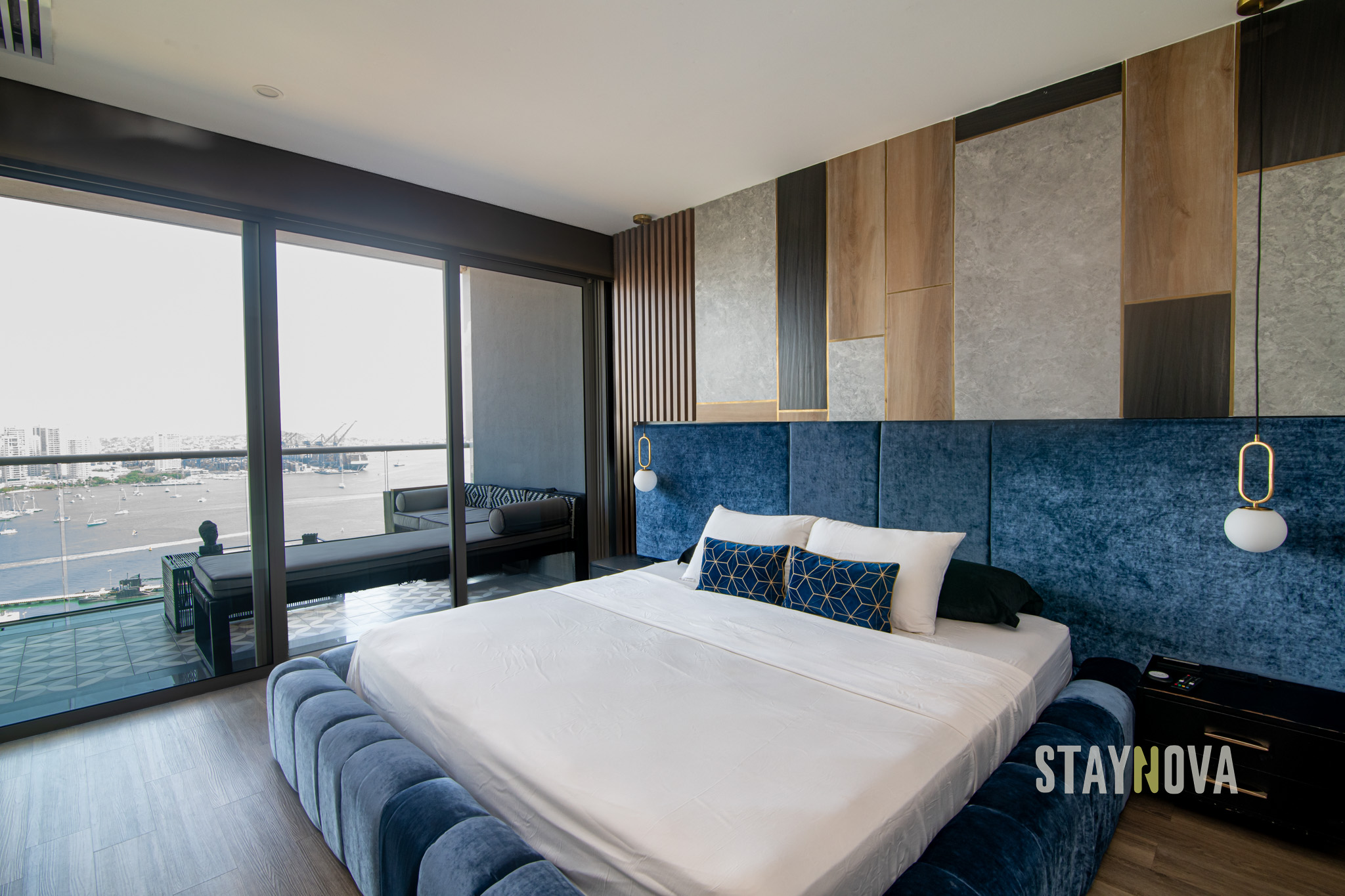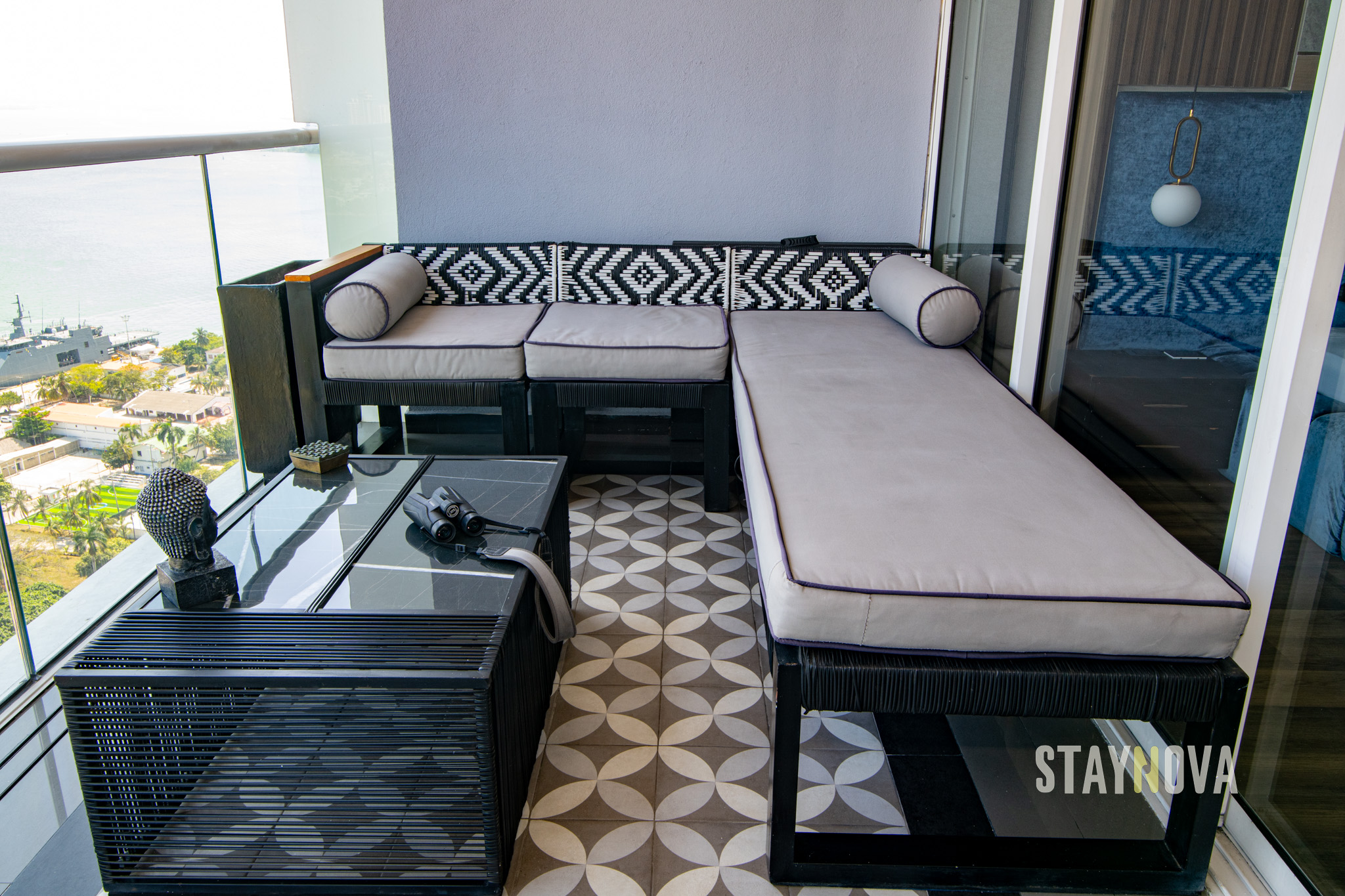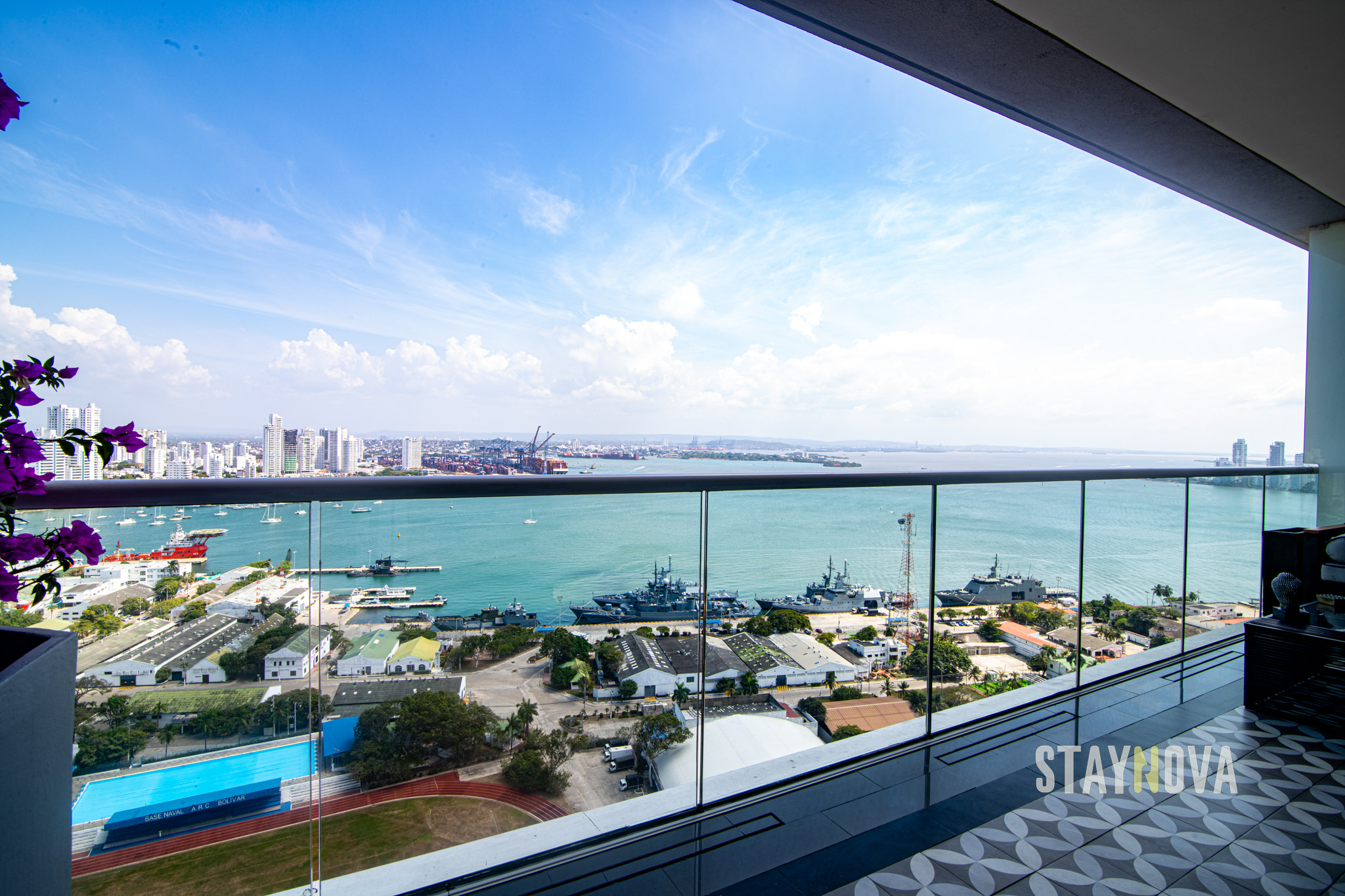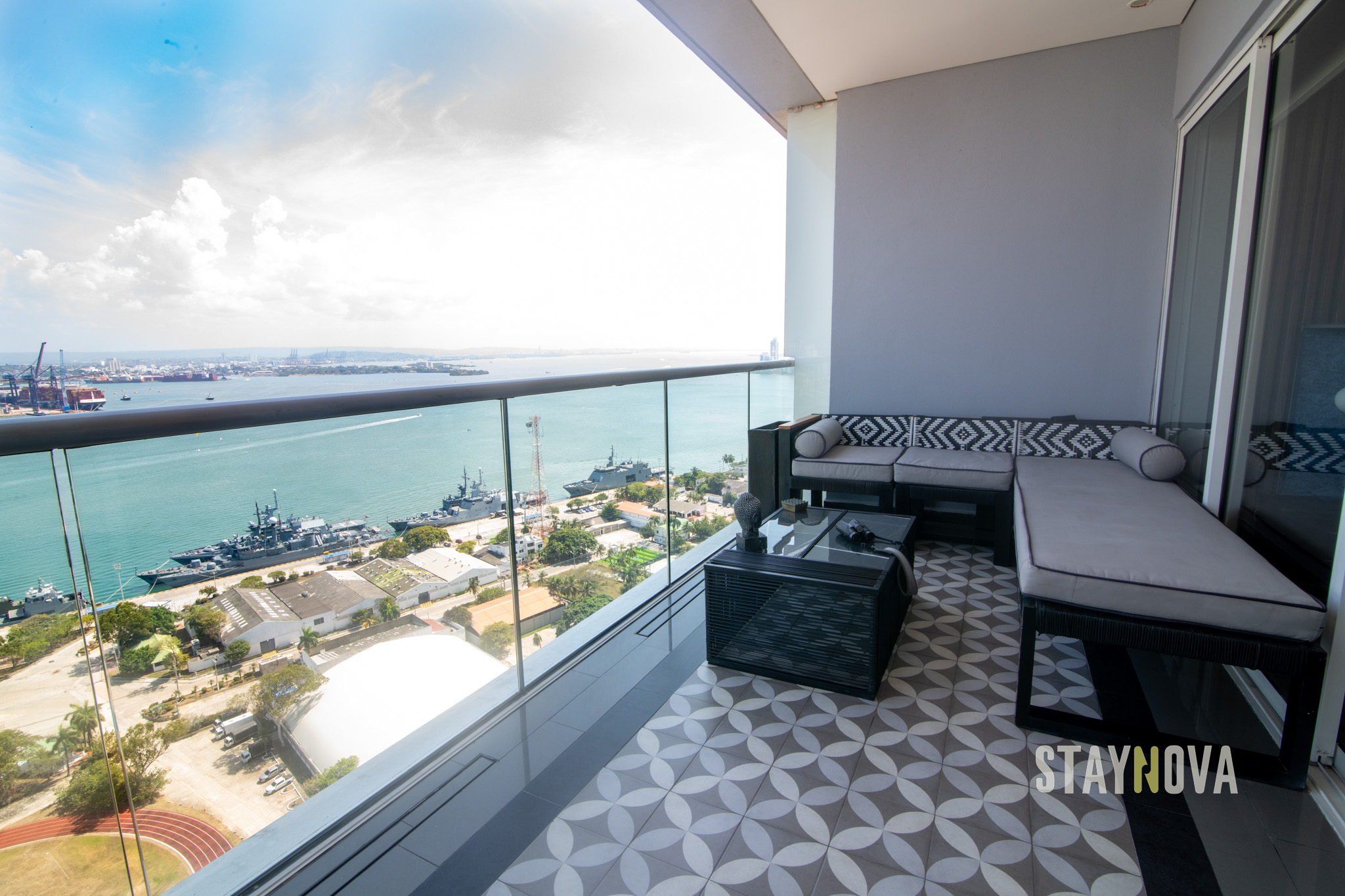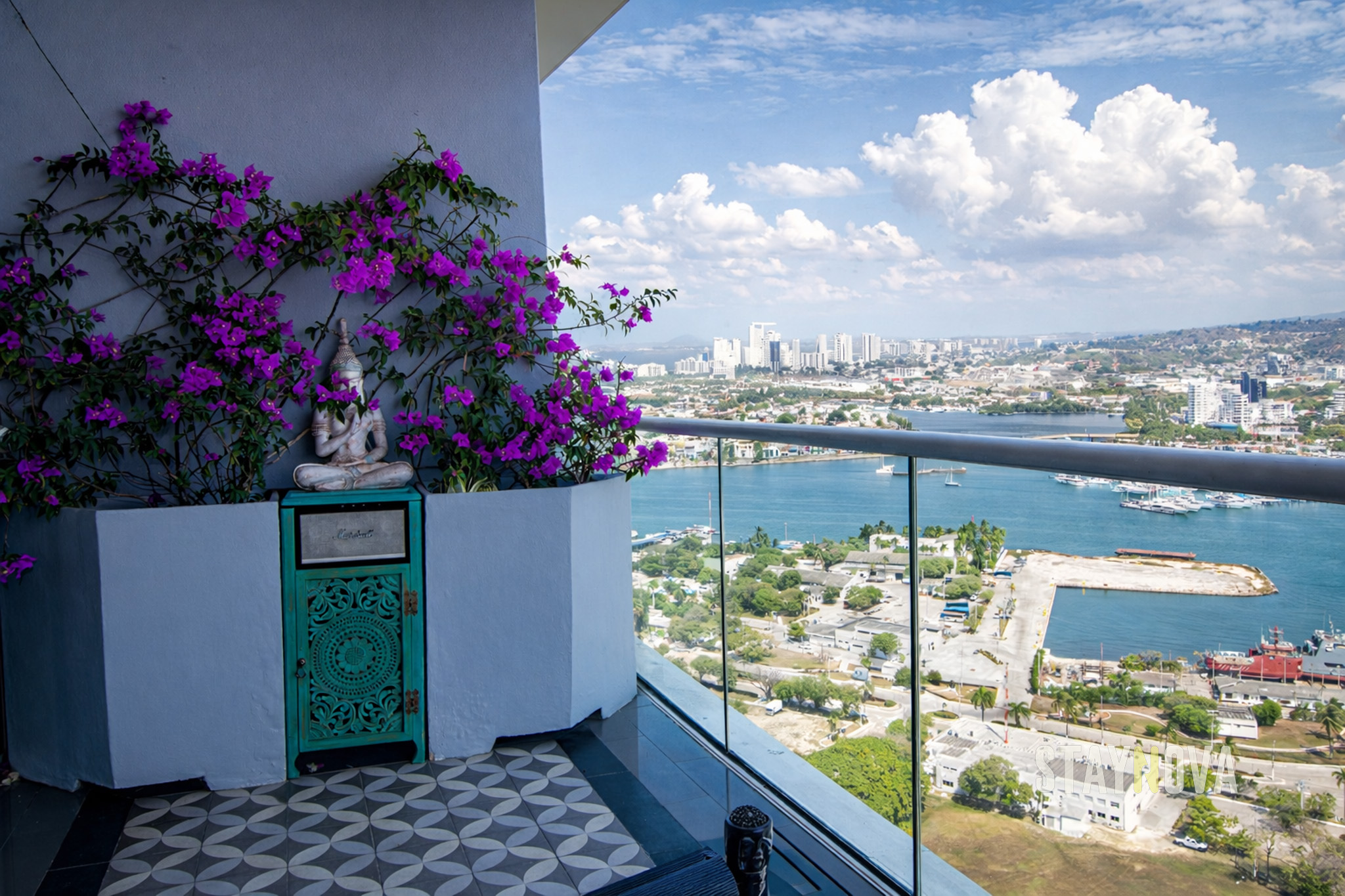 En el balcón de la Suite Presidencial podrá disfrutar de un sofá cama exterior muy cómodo, un comedor seis puestos, una mesa de centro, tapetes de yoga, plantas veraneras, binoculares, Budas y un Bose Marshall de última tecnología, además podrá apreciar una impresionante vista hacia la bahía de Cartagena, El Cerro De La Popa, la Sociedad Portuaria, la Base Naval Marina, Getsemaní, Manga, El Castillo y El Centro De Convenciones.